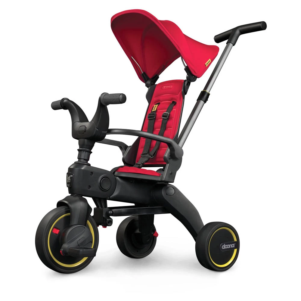 - Fase 1, voor kinderen van ca. 10 tot 18 maanden, gebruik je Liki met veiligheidsbeugel, hoge rugleuning, de pedalen in de achterste positie als een voetensteun, met UV-Zonnedak en duwstang.