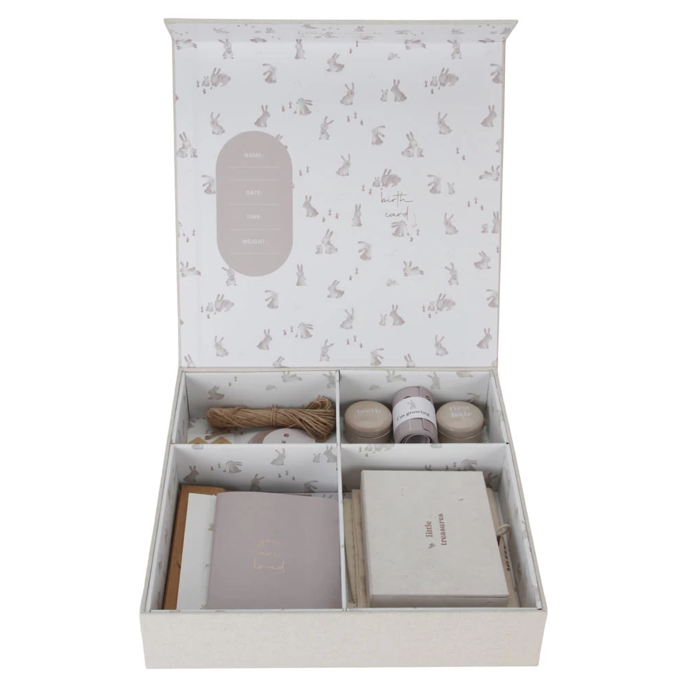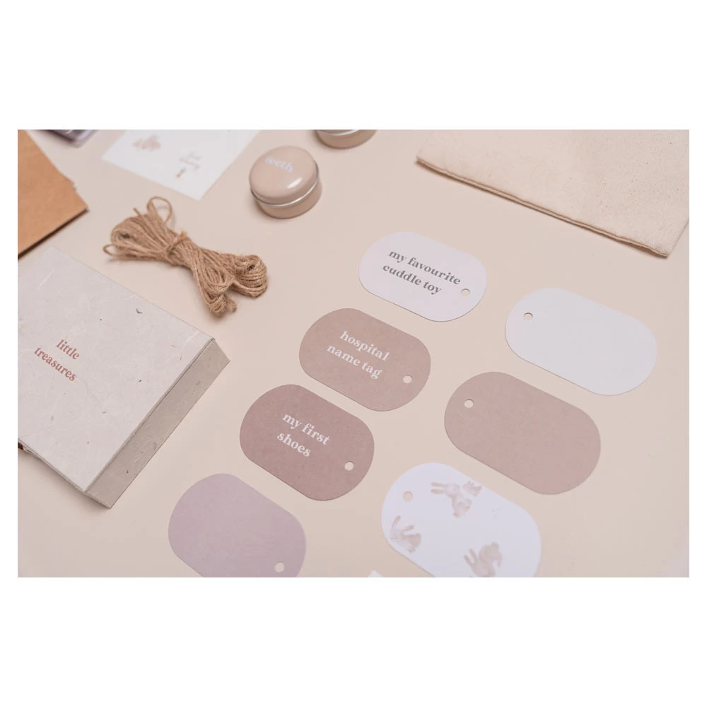 - Opbergdoos met opbergzakken, meetlint, opbergdozen, enveloppen, labels, een boekje en touw.