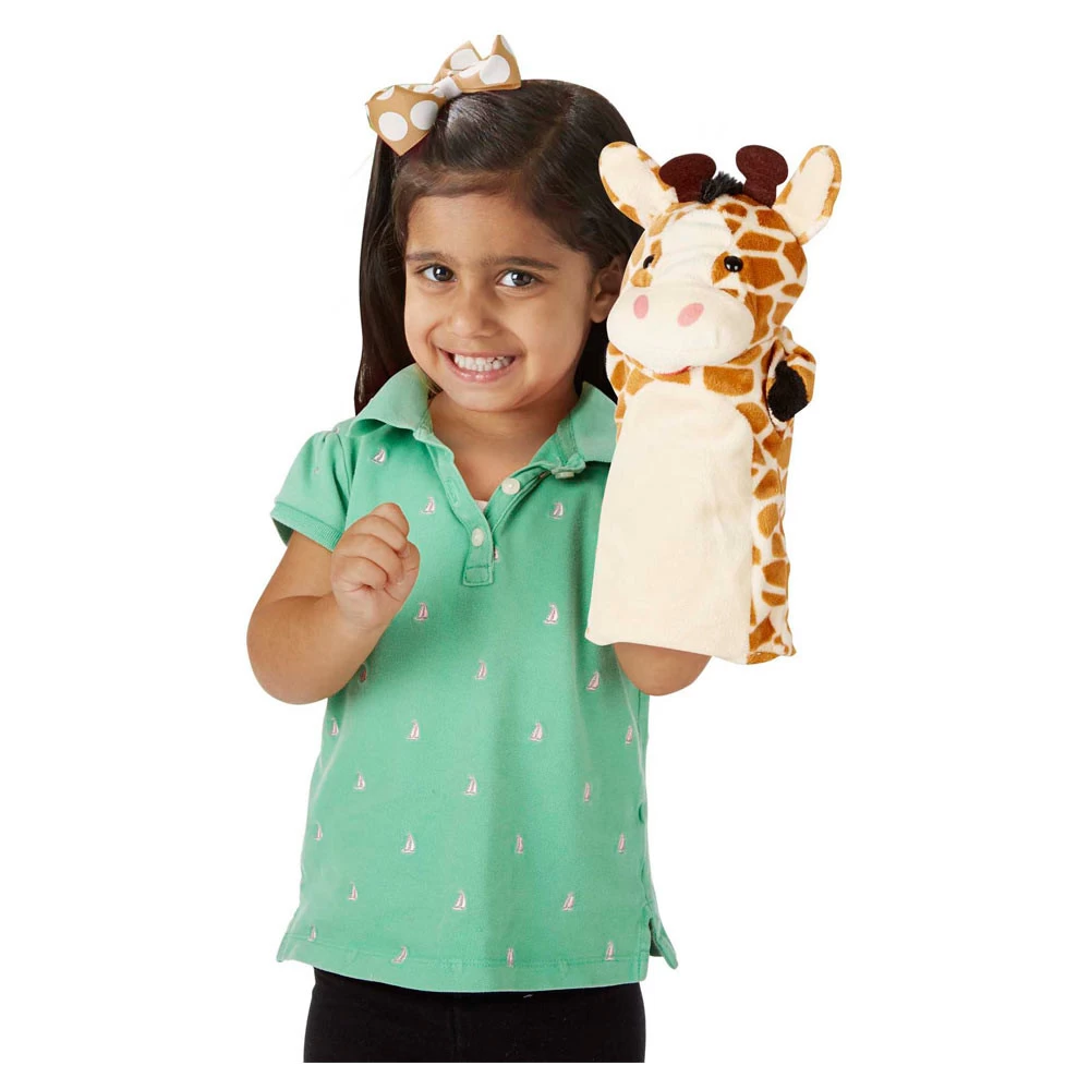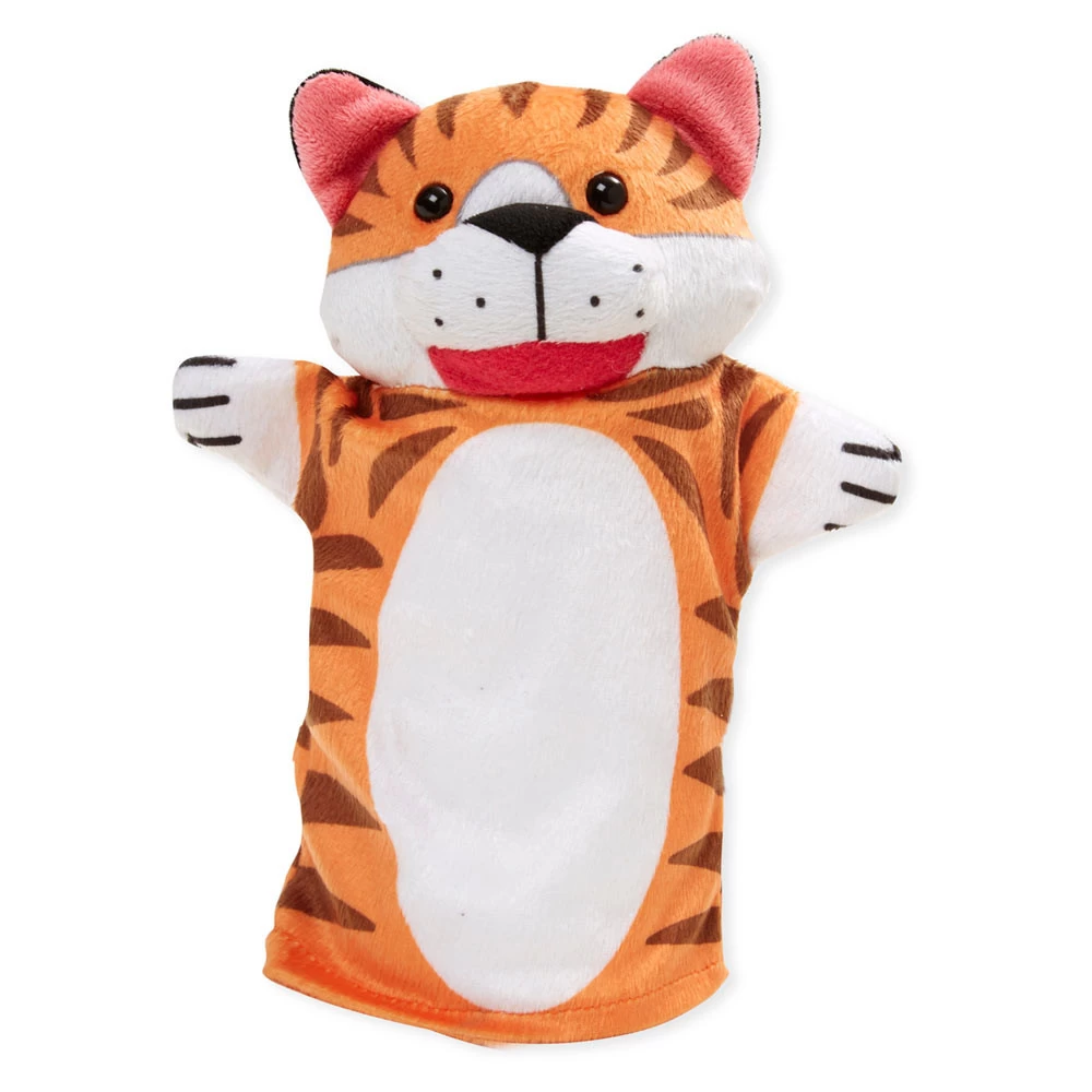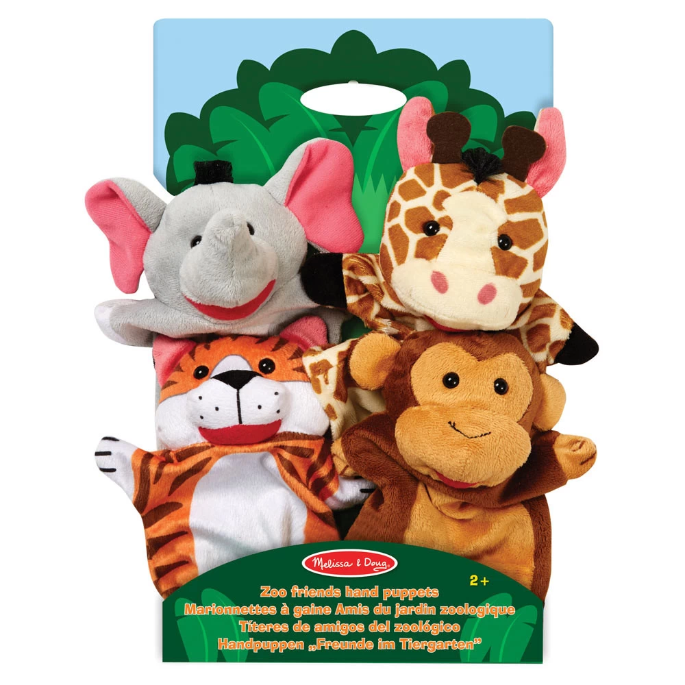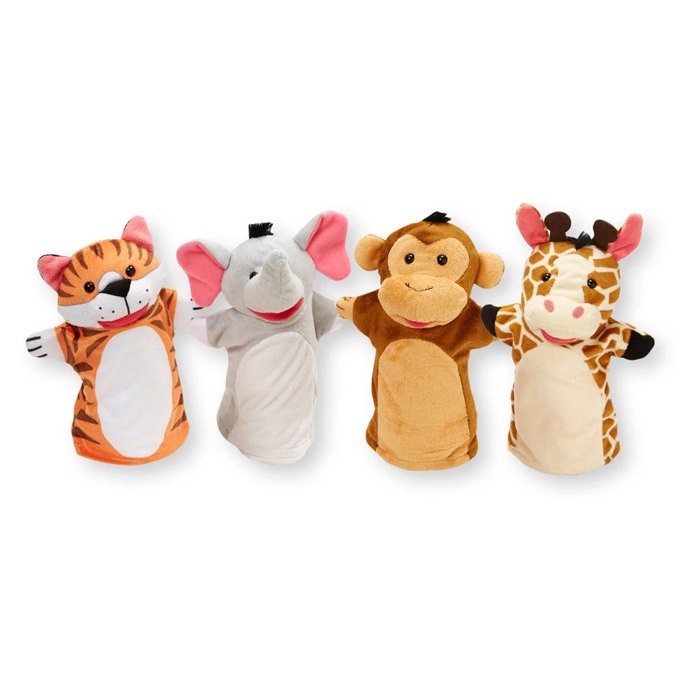 - Vier zachte handpoppen in een dierenthema.