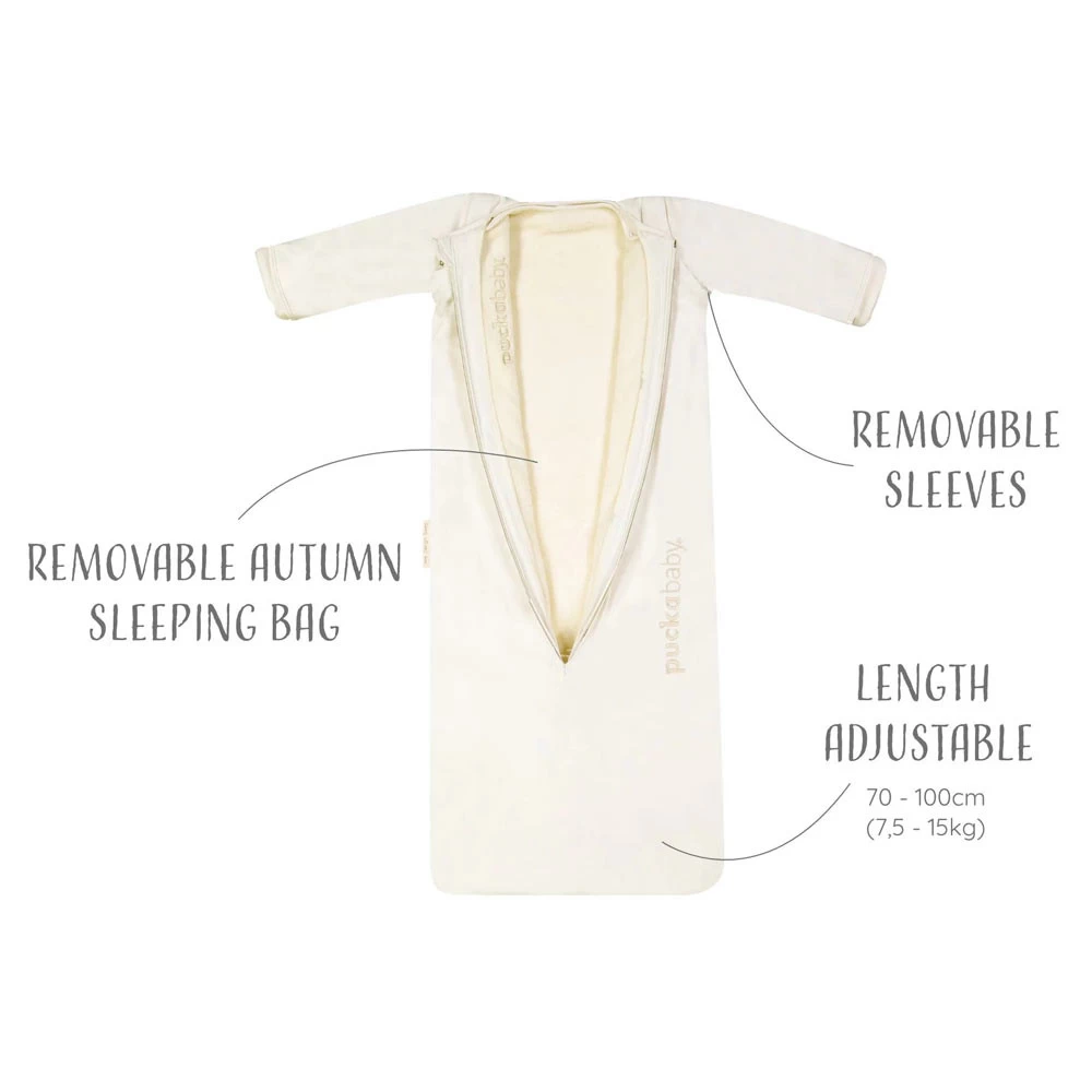 - Herfst: gebruik alleen de teddy binnenzak in de herfst. Rits de binnenzak open en keer hem binnenstebuiten, zodat de teddy aan de buitenkant zit in plaats van aan de binnenkant. Op deze manier heeft de slaapzak een TOG-waarde van 2.0.